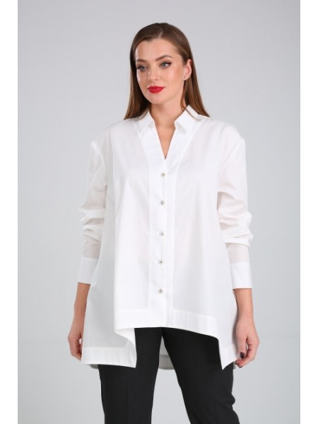 Блузка из натуральных тканей свободного силуэта, расширенная к низу. Центральная часть блузки, а также низ обработаны обтачной планкой. По переду блузка застёгивается на 5 петель и пуговиц. Рукав свободного покроя. По низу рукава притачан манжет, который застёгивается на 2 петли и пуговицы. Низ блузки асимметричный. По переду блузка короче, имеет угловатый, красивый переход и по спинке плавную линию с изгибом. Вырез горловины V-образный Воротник на стойке отложной. Длина по центру переда от плеча-72 см. Длина по центру спинки-83 см. Длина рукава-63 см с манжетом. Ширина спинки-53 см. Ширина по линии груди в полуобхвате 56р- 60 см, 58р-62 см, 60р-64 см