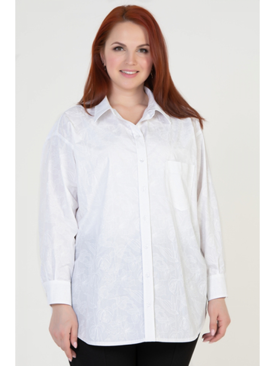 Блуза прямого силуэта, разноуровневая. Перед по центру с планкой, застегивающейся на петли и пуговицы, с накладным карманом . Плечо спущенное, рукав длинный, втачной, по низу на притачной манжете, застегивающейся на петлю и пуговицу. Спинка с кокеткой. Воротник с острыми концами на стойке, застегивающейся на петлю и пуговицу. Размеры блузы сдвоенные.