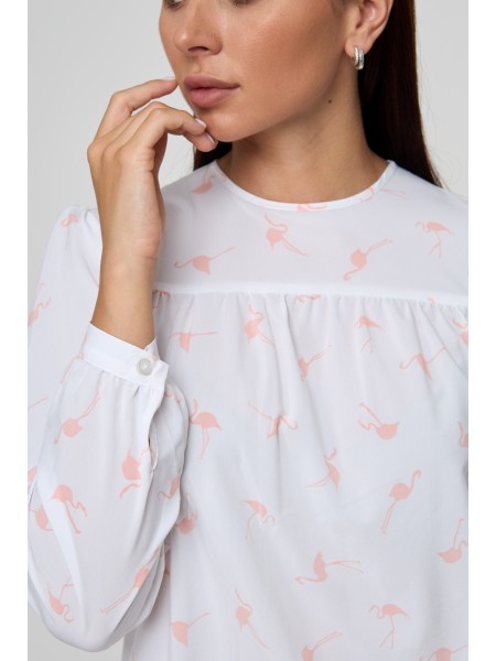 Блузка выполнена из легкой принтованной ткани.