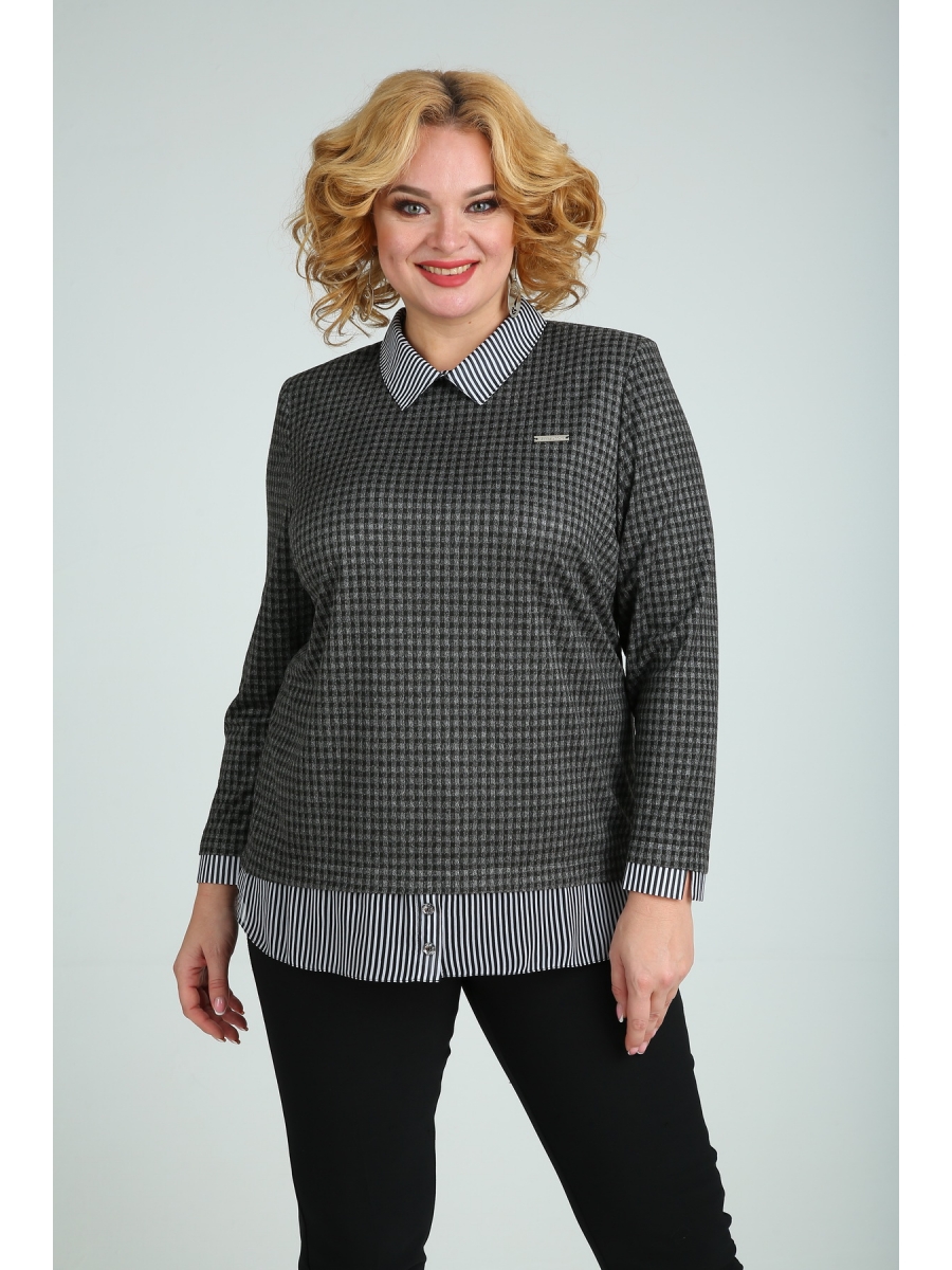 Блузка женская прямого силуэта с втачными одношовными рукавами. Перед с нагрудными вытачками, выходящими из бокового шва. По низу изделия притачная деталь контрастного цвета с пуговицами, имитирующая рубашку. Воротник стояче-отложной. Низ рукава обработан притачной манжетой с разрезом из контрастной ткани. Спинка цельная, с застежкой на стойке воротника на петлю и пуговицу. Блузка с плечевыми накладками.