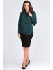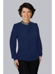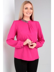Блуза женская, прямого силуэта с нагрудными вытачками. Воротник втачной, стойка, украшенный стразами по правой стороне. От линии груди к стойке, по левой стороне, идут складки, закрепленные по горловине. Застежка центральная, по спинке, на «слезку». Рукав втачной, одношовный, с притачным манжетом.