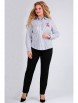 Блуза приталенного силуэта, с центральной бортовой застежкой на потайной планке. С лицевой стороны правой полочки выполнены декоративные петли контрастного цвета. На полочках от продольных рельефов идут нагрудные вытачки. Рукав втачной с притачным манжетом, длину которого можно отрегулировать «патой», разрез выполнен планкой в виде «домика». На спинке имеются талевые вытачки. Воротник на стойке, рубашечный.