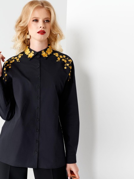 Изысканная блузка с дизайнерской вышивкой по пере ду и по воротнику. Блузка прямого силуэта, рукава слегка спущенные, длинные. По бокам небольшие разрезы. Застежка сквозная на петли и пуговицы. Отличная блузка как в офис, так и для любого праздничного мероприятия.
