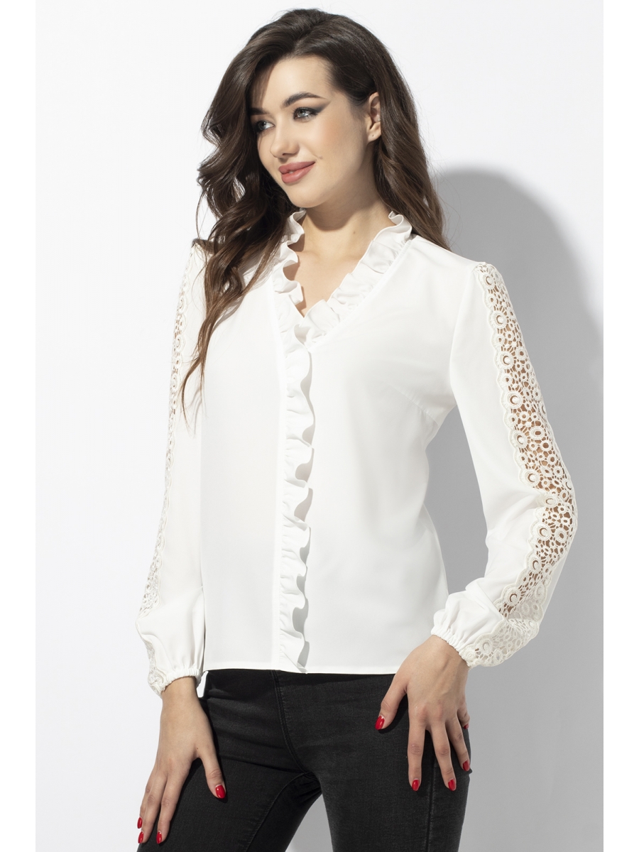 Блуза женская делового стиля прямого силуэта. Перед из двух частей с нагрудными выточками. Спинка цельная. По центру переда и горловине вставлена рюша. Рукав втачной из двух частей по центру с настроченным кружевом. Низ рукава на эластичной тесьме.