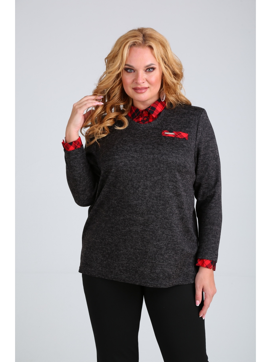Блузка женская прямого силуэта с втачными одношовными рукавами. Перед с нагрудными вытачками, выходящими из бокового шва. Воротник-обманка рубашечного кроя на притачной стойке. Рукава втачные одношовные. По низу рукавов притачные манжеты из контрастной ткани. Спинка цельная. По низу боковых швов обработаны разрезы.