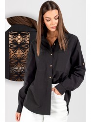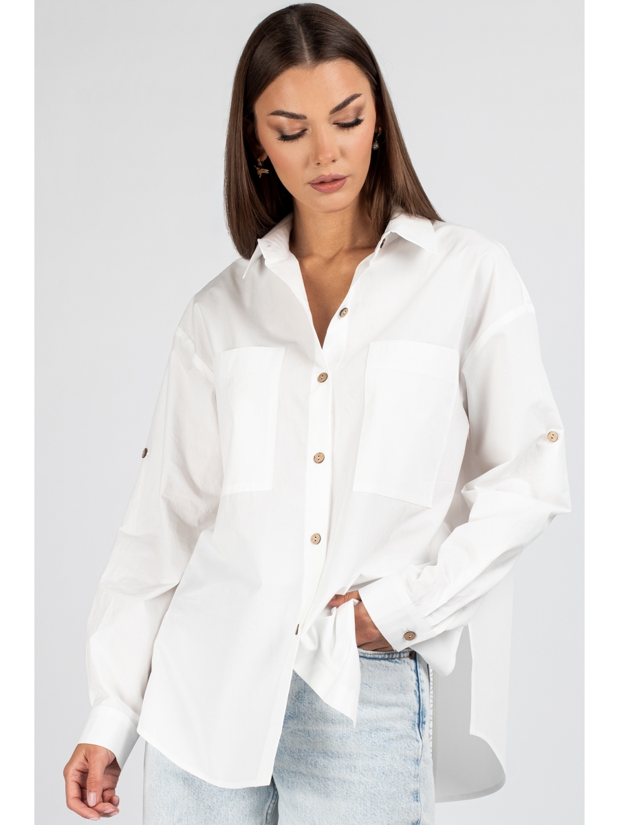 Женская блузка (рубашка) прямого силуэта со спущенным плечом. Передняя часть блузки состоит из двух частей, с центральной бортовой застежкой на 6 петель и пуговиц и настроченными карманами. Спинка украшена вставкой из кружева. Рукава имеют нашитую пату с пуговицей и притачную манжету, которая застегивается на одну петлю и пуговицу.