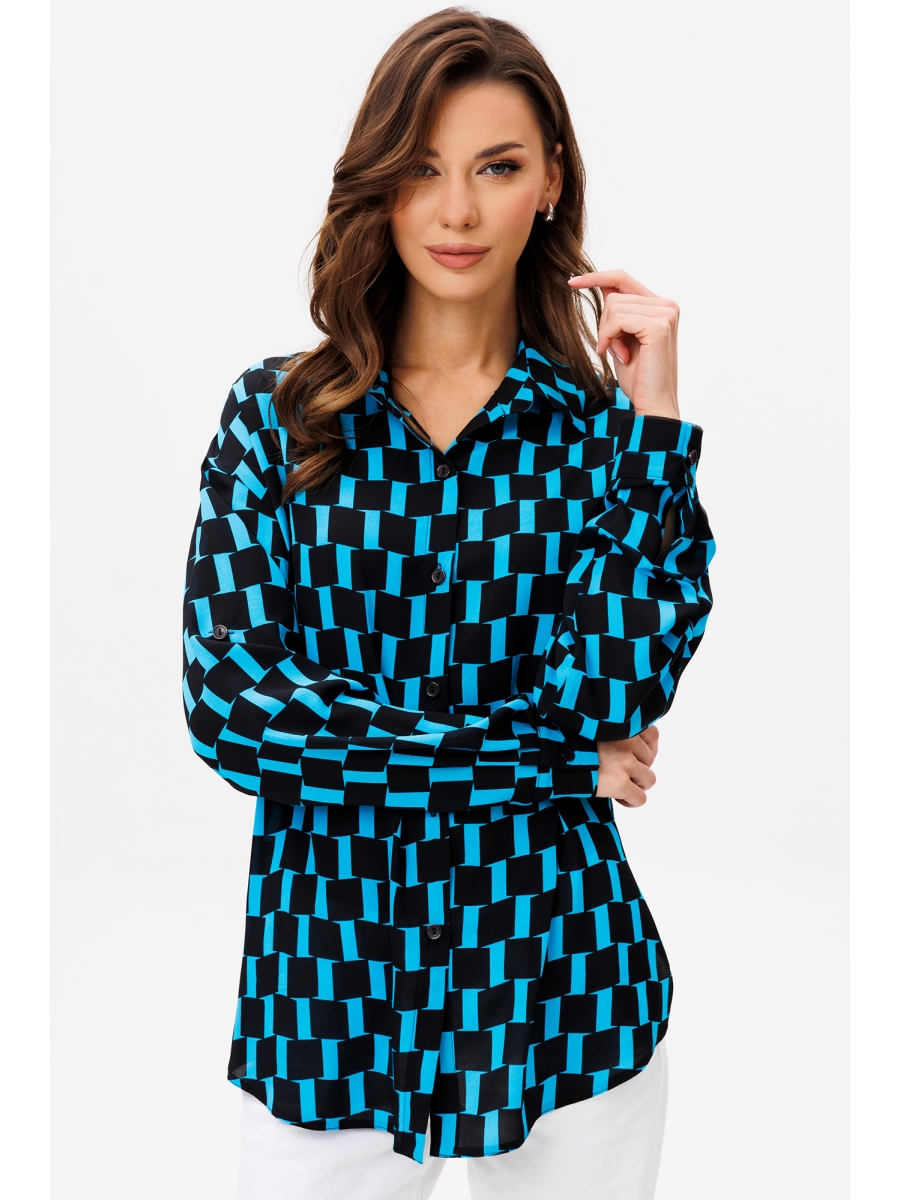 Блузка женская прямого силуэта со спущенным плечом. Перед состоит из 2 частей с центральной бортовой застёжкой на 6 петель и пуговиц. Спинка цельная. Рукав с настроченной патой с пуговицей. Низ рукава оформлен притачной манжетой, застёгивающейся на 1 петлю и пуговицу. Воротник рубашечного типа с отрезной стойкой.