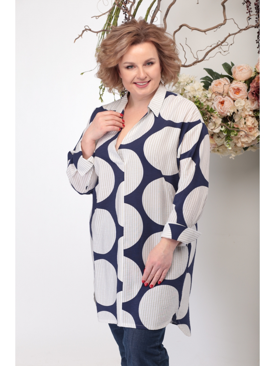 Удлинённая блузка выполнена из вискозы с добавлением синтетических волокон, которые делают изделие струящимся. Нарядная яркая расцветка хорошо вписывается как в классический, так и спортивный гардероб. Спинка удлинена по отношению к переду. Приспущенный рукав с широкой отгибающейся манжетой на пуговице, рубашечный воротник и V-образный вырез делают блузку универсальной и модной. Изделие хорошо сочетается с брюками.