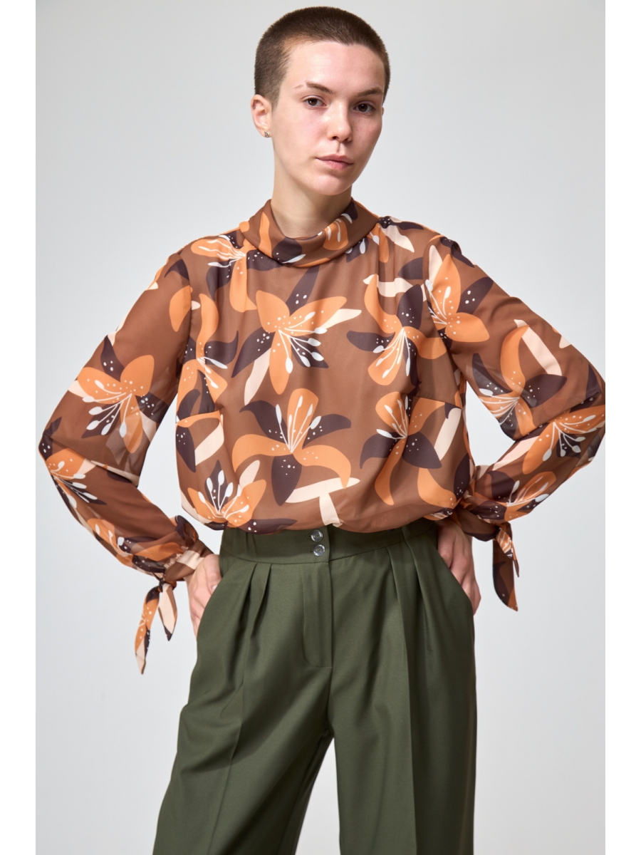 Блузка из шифона с цветочным принтом. прямого силуэта, на трикотажной подкладке по полочке и спинке. Горловина оформлена отложным воротником, с разрезом и застежкой на навесную петлю и пуговицу на спинке. Перед с нагрудными вытачками. Спинка со средним швом. Рукав втачной прямой длинный, по низу с декоративной манжетой с завязками.