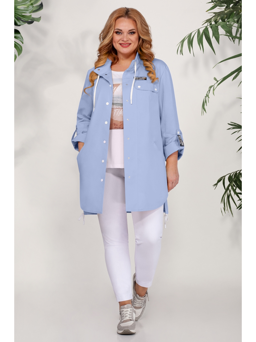 Рубашка женская из плотного джинса, прямая, с центральной застежкой на 8 кнопок, с воротником "стойка" с кулисой и шнуром, перед с фигурными рельефами и карманами в швах, левая часть переда с кокеткой и клапаном с кнопками. Спинка с кокеткой и пришивным декором, рукава рубашечные с вертикальными рельефами и манжетами с патой на кнопках.