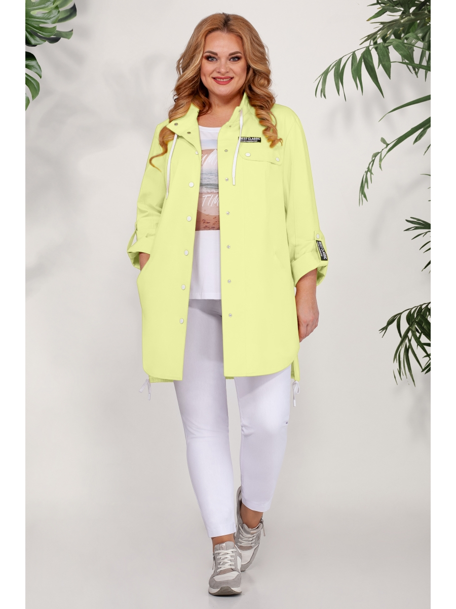 Рубашка женская из плотного джинса, прямая, с центральной застежкой на 8 кнопок, с воротником "стойка" с кулисой и шнуром, перед с фигурными рельефами и карманами в швах, левая часть переда с кокеткой и клапаном с кнопками. Спинка с кокеткой и пришивным декором, рукава рубашечные с вертикальными рельефами и манжетами с патой на кнопках. По кокетке и патам настрочена декоративная тесьма.