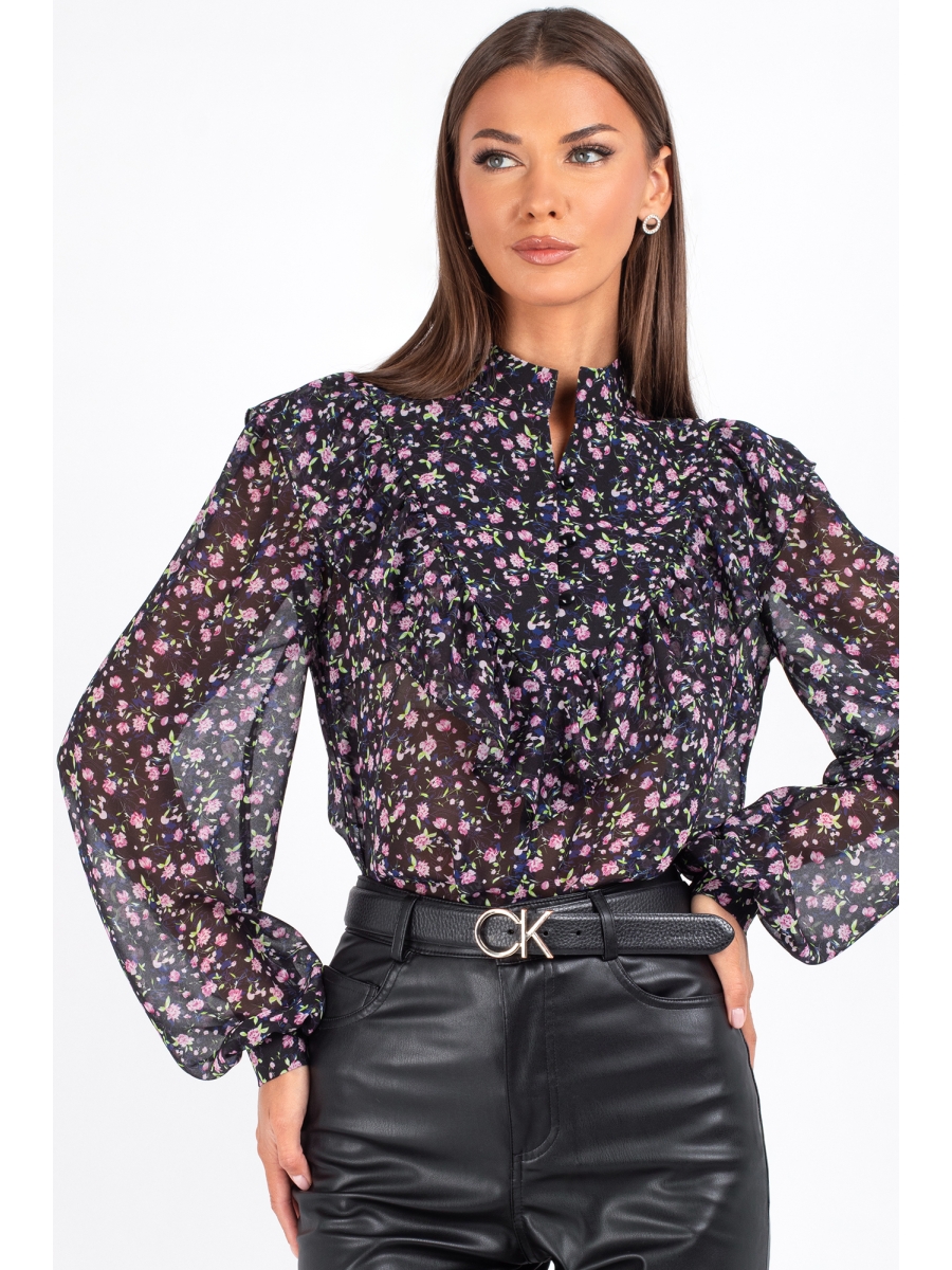 Блузка с длинным рукавом выполнена из ткани с цветочным принтом — мелкие розовые, сиреневые и зелёные цветы на чёрном фоне создают эффект глубины и утончённости. Идеально сочетается с кожаными брюками, юбками и классическими джинсами.