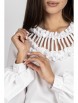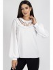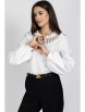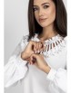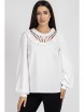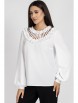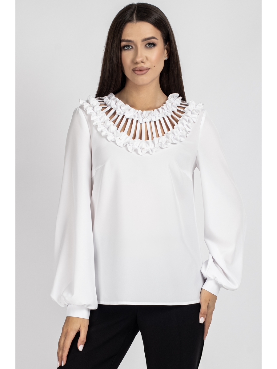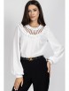 Блузка женская полуприлегающего силуэта. Перед с нагрудными вытачками. Отделочным элементом переда является V-образный вырез с планочками и настроченными рюшами. На рюшах жемчуг. Спинка с капелькой и застежкой на навесную петлю и пуговицу. Рукав втачной, внизу со сборкой и притачной манжетой. Манжета застегивается на петлю и пуговицу.