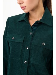 Рубашка прямого силуэта из хорошо растяжимой ткани «вельвет» красивого изумрудного цвета. Воротник сорочечного типа, застёжка на кнопках по притачным планкам переда. Накладные нагрудные карманы с клапанами, застегивающиеся на кнопки. Рукава втачные длинные с притачными манжетами по низу ,на левом рукаве карман с клапаном и лентой на полукольцах. Спинка с притачной кокеткой и бантовой складкой. Идеальна для наступившего сезона в сочетании с брюками, кардиганом, пальто.
