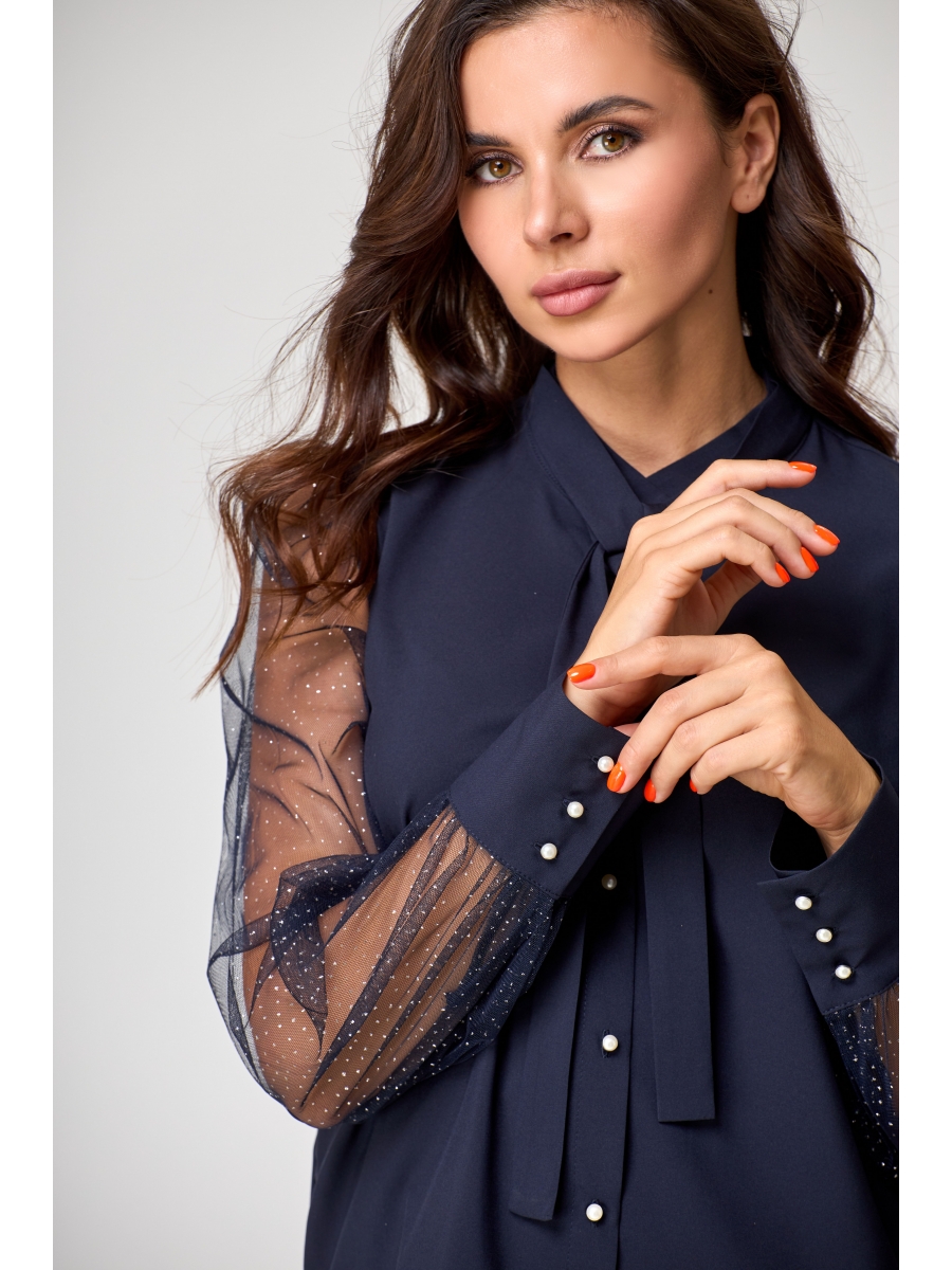 Эффектная блуза с объемными рукавами из сетки с переливающимся мерцанием не оставит Вас незамеченной! Блуза прямого силуэта умеренного объема, средней длины. На передней части блузы обработаны нагрудные вытачки.