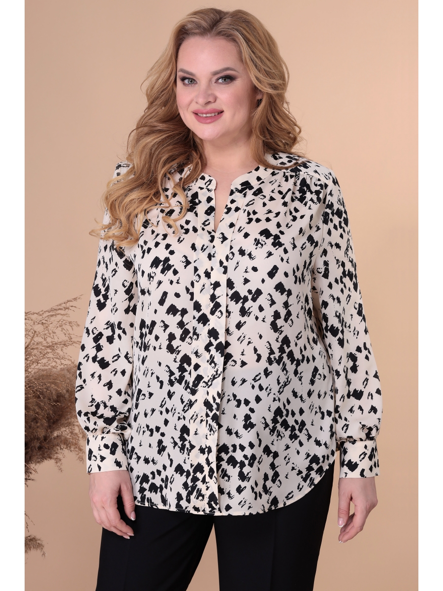 Женская текстильная блузка прямого силуэта. Рукав втачной, расширенный, внизу со сборкой и манжетой с застежкой на пуговки. Вырез горловины фигурный. Спереди по плечам кокетки, под которыми обработаны сборки. Средний шов переда со складками, переходящими в горловину. Низ изделия фигурный закругленный.