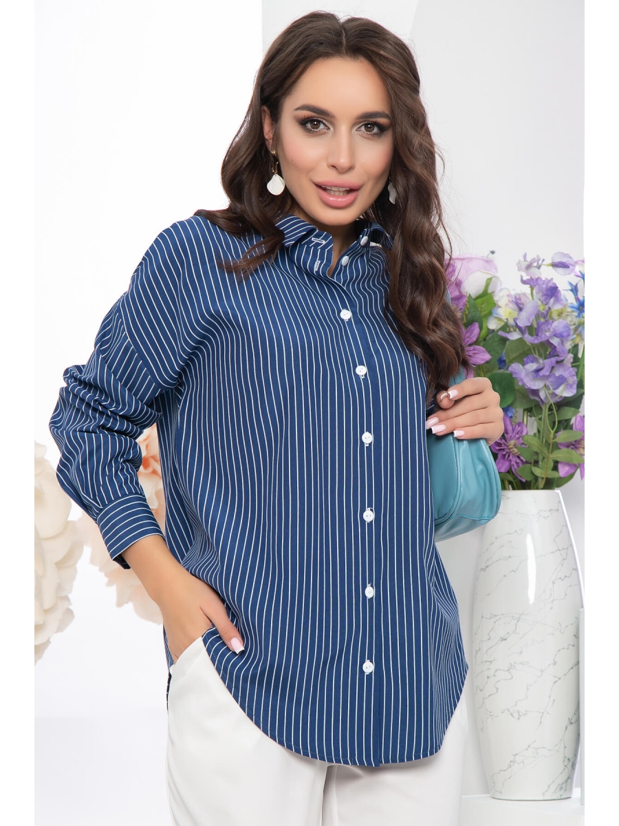 Рубашка из хлопка в классическом синем оттенке. Свободный крой рубашки обеспечивает максимально свободную посадку на фигуре. С такой моделью можно создать и официально-деловой образ и расслабленный. Рубашка имеет длинный втачной рукав на манжете. По переду застегивается на пуговицы. Такая модель позволит скорректировать фигуру, так как по переду и спинке удлинена.