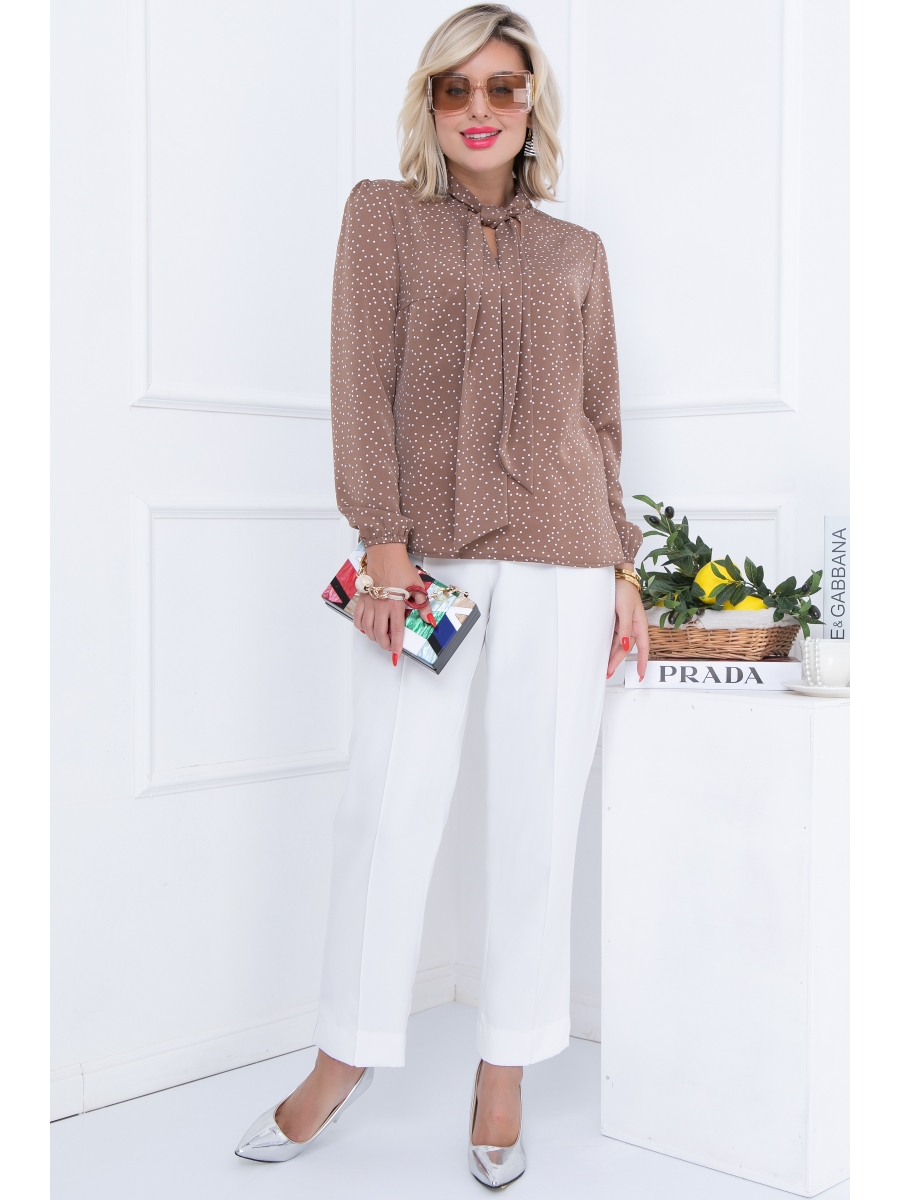 Романтичная блузка Мила из лёгкой блузочной ткани, которая добавит женственности в Ваш образ! Вырез горловины V-образный, изящно переходящий в галстук, который можно завязать в бант, оригинальный узел или вовсе оставить свободным. Данная модель – всесезонная и дополнит Ваш базовый гардероб. Ее можно носить в осенне-зимний и весенне-летний сезоны! Рукава длинные, на резинке. Блузка в цвете какао – это отличный выбор для повседневного образа или для особых случаев, таких как деловые встречи или вечерние мероприятия. Она позволяет выглядеть элегантной и стильной, при этом чувствовать себя комфортно и уверенно. Пояс Козьерра в комплект не входит.