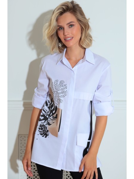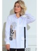 Блузка полуприлегающего силуэта с приспущенной линией плеча. Рукав длинный, втачной, одношовный с притачной манжетой и складками по низу, длину рукава можно регулировать за счет хлястика. Воротник стояче-отложной с отрезной стойкой. Застежка с цельнокроеной потайной планкой на петли и пуговицы. По левой части переда кокетка с декоративной хлопковой тесьмой, накладной функциональный карман с клапаном. По правой части переда декоративный принт. В боковых швах расположены разрезы.