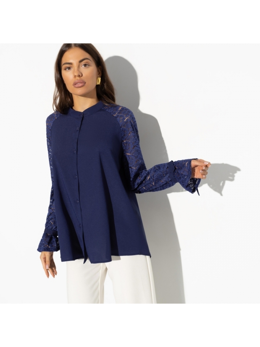 Глубина – то, что мы ищем в отношениях с миром. Погрузиться с головой, ощутить всю полноту чувств... Глубокий синий – цвет для тех, кто ценит фундаментальность жизни. Блуза свободного кроя. Идеальна для любого типа фигуры. Рукава из прозрачного кружева оформлены завязками. Легкая ткань обеспечивает струящиеся силуэт.