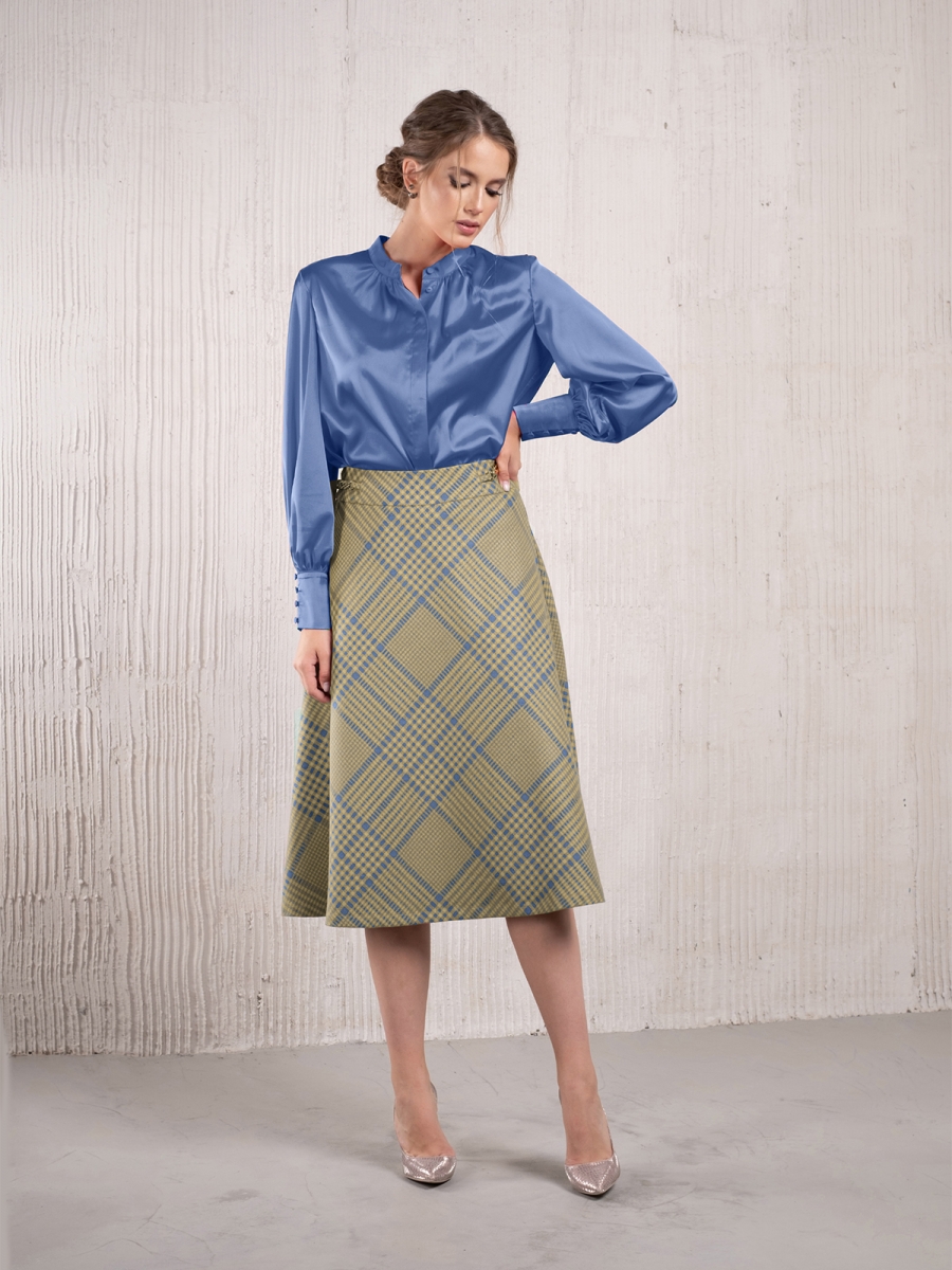 Блуза свободного кроя из легкого атласа с матовым блеском. Застежка на пуговицы спереди. Рукав втачной, низ обработан манжетой, застегивающейся на пуговицы.