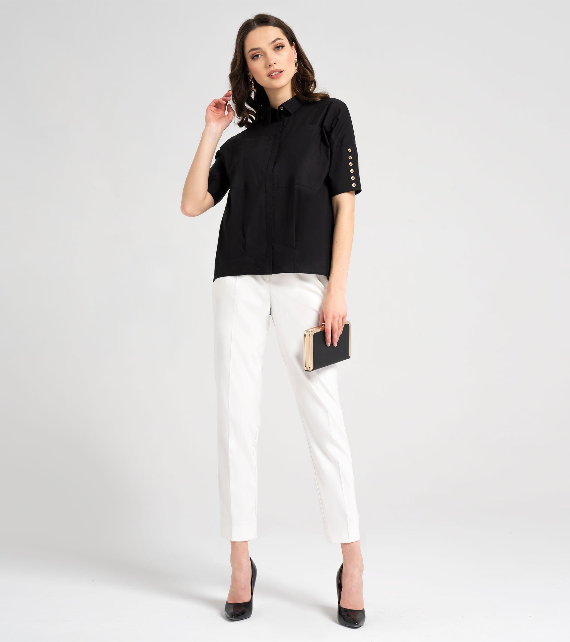 Молодежная блузка силуэта "оверсайз". Блузка с центральной сквозной застежкой на потайные петли и пуговицы и одну сквозную петлю и пуговицу на воротнике. Блузка с широкими манжетами с декоративными петлями и пуговицами. По переду блузки имеются декоративные складки по низу. На груди расположены большие декоративные карманы. Спинка блузки слегка удлиненная. Отличный вариант как в офис, так и в сочетании с любимыми джинсами для повседневных дней.