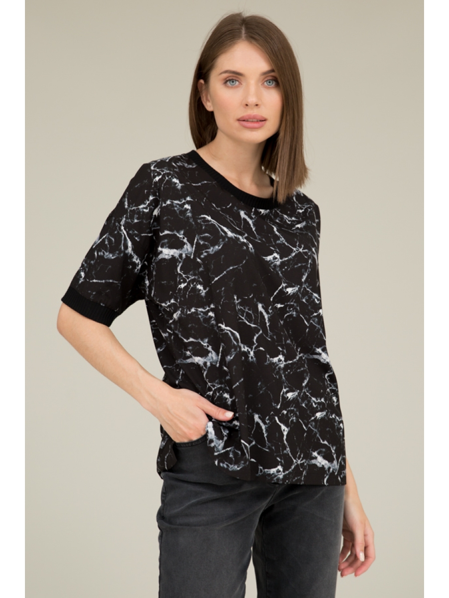 Блуза свободного силуэта с разрезами в боковых швах из блузочной ткани. Рукав втачной в спущенную пройму. Линия горловины и низ рукава оформлены эластичным полотном в рубчик.
