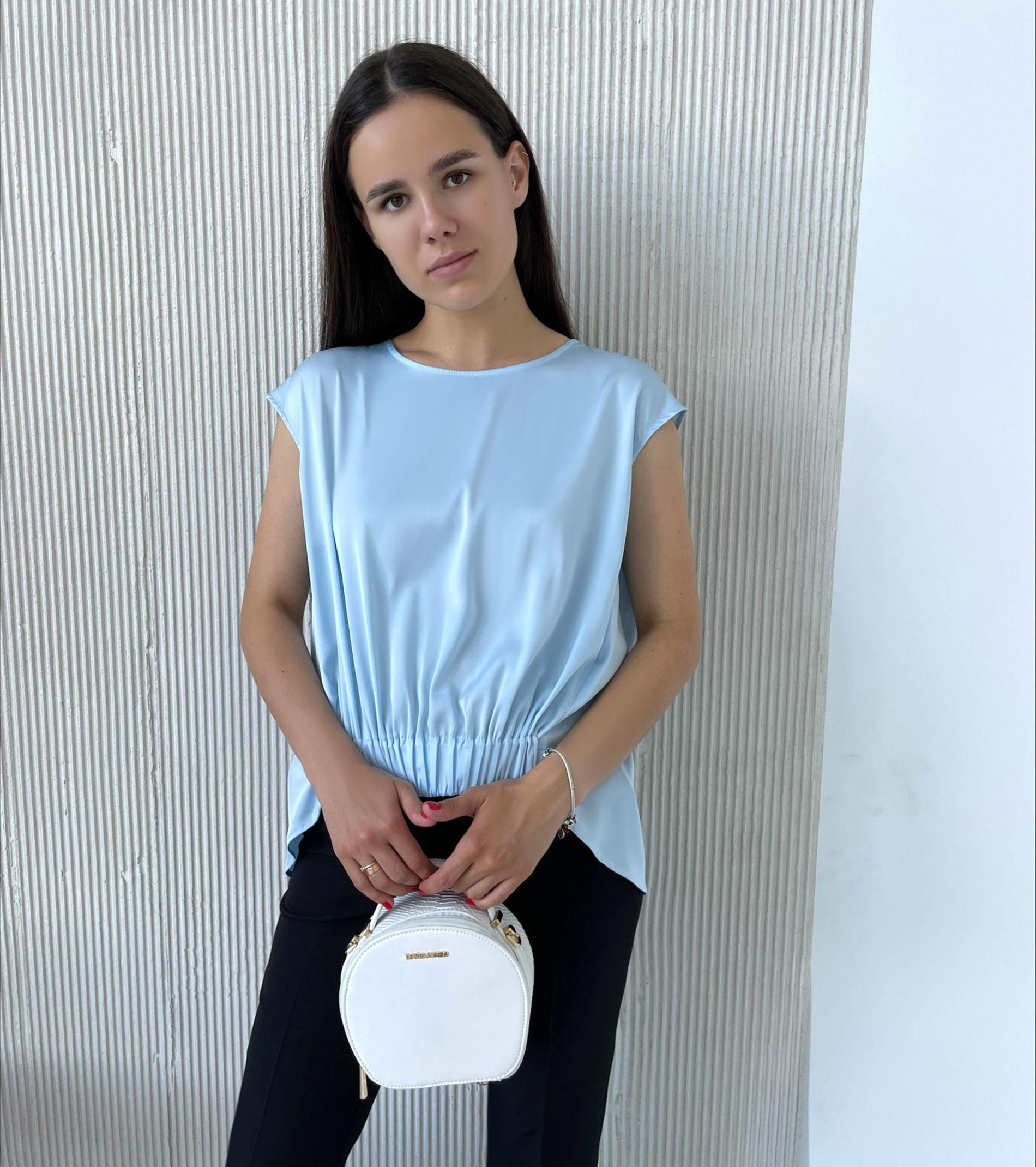 Элегантная женская блузка молочного цвета – нарядный вариант для жаркого лета. Ассиметричный крой с укороченным передом и удлиненной спинкой делает модель оригинальной. Впереди вшита резинка, которая находится на уровне талии. Летняя блузка без рукавов выполнена из трикотажа, она приятна к коже, мягкая и легкая. Она подойдет для офисного и повседневного стиля. Сочетайте короткую женскую блузку с брюками и различными аксессуарами, чтобы создать эффектные образы. Вы можете купить модную женскую блузку для себя или на подарок сестре, подруге.