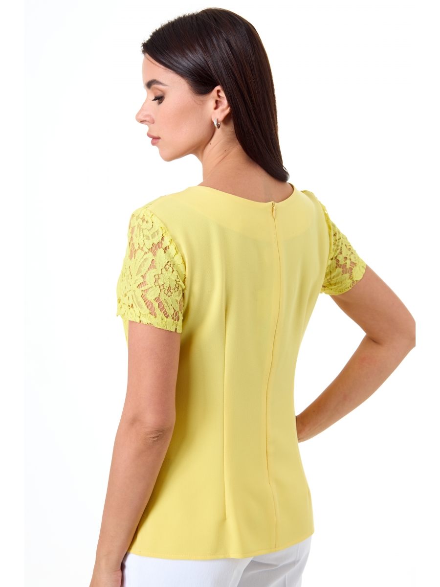 Блузка выполнена в комбинации ткани с кружевным полотном.