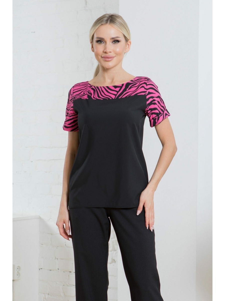 Блуза прямого силуэта. Выполнена из эластичной блузочной ткани. Расцветка черный с принтом зебра черный-фуксия. Вырез круглый. Рукава короткие 19 см с отворотами. Отрезная кокетка по переду. Низ прямой. Без подклада. Без застёжки. Блузка для работы и повседневной носки. Рекомендуемая стирка при t не более 30. Рост модели 168 см, 44 размера.