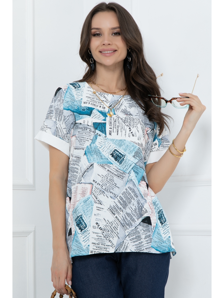 Граттери – летняя легкая блуза свободного кроя из блузочной ткани с принтом. Рукав короткий, цельнокройный с манжетом. Газетный принт – яркий и запоминающийся тренд в мире моды. При создании образа с такой блузкой советуем отдавать предпочтение белоснежным брюкам или джинсам, такое сочетание будет выглядеть красиво и нарядно.