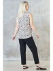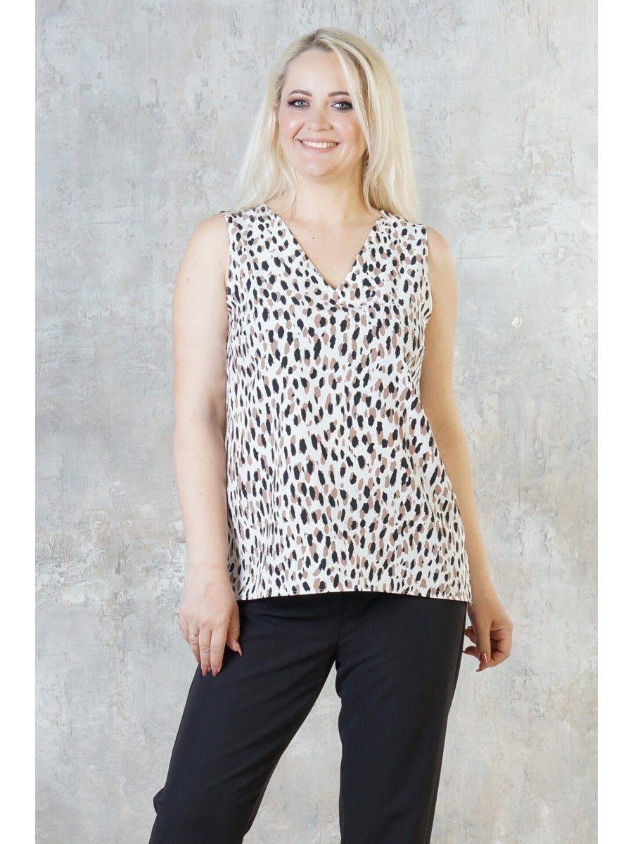 Блуза "топ"из эластичной блузочной ткани. Расцветка чёрно бежевый принт на молочном. V-образный вырез горловины. Без рукавов.