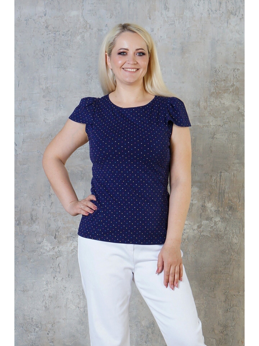 Блуза из трикотажного полотна. Расцветка яркие точки на тёмно-синем. Круглый вырез горловины с защипом. Рукава короткие 16 см. С рельефом. Без застёжки. ДИ в 48 р 63 см., 50-52 р 64 см, в 54-56 р 65 см, в 58-60 р 66 см, в 62-64 р 67 см. Рост модели 168 см., размер изделия 52.