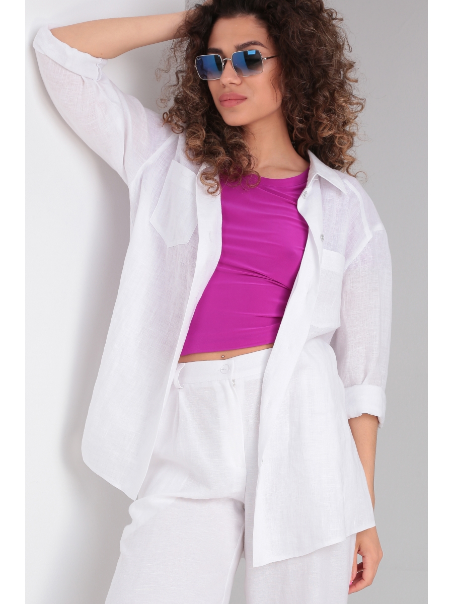 Блузон свободного силуэта с накладными карманами по полочке. Воротник рубашечного типа на стойке. Рукав втачной на спущенной пройме с застежкой на петли пуговицы.