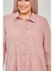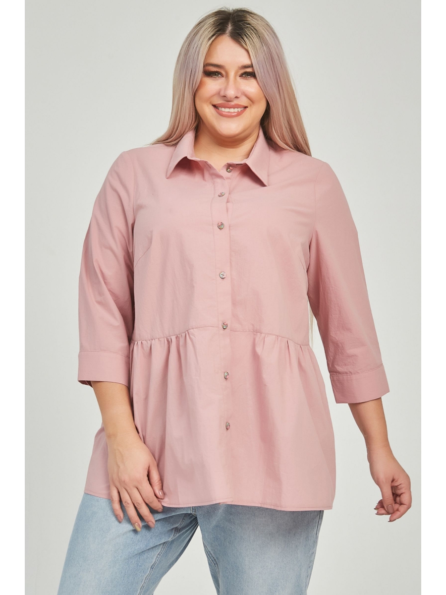 Рубашка полуприлегающего силуэта из хлопковой ткани, длиной за линию бедра. Прилегание по груди достигнуто за счет вытачек. Перед с горизонтальными подрезами в области талии, нижняя часть переда со сборкой. Горловина оформлена отложным воротником на притачной стойке. По центру планка с застежкой на петли и пуговицы. Втачные рукава длиной 7/8 по низу дополнены складками и манжетой с застежкой на петли и пуговицы. Низ ровный.