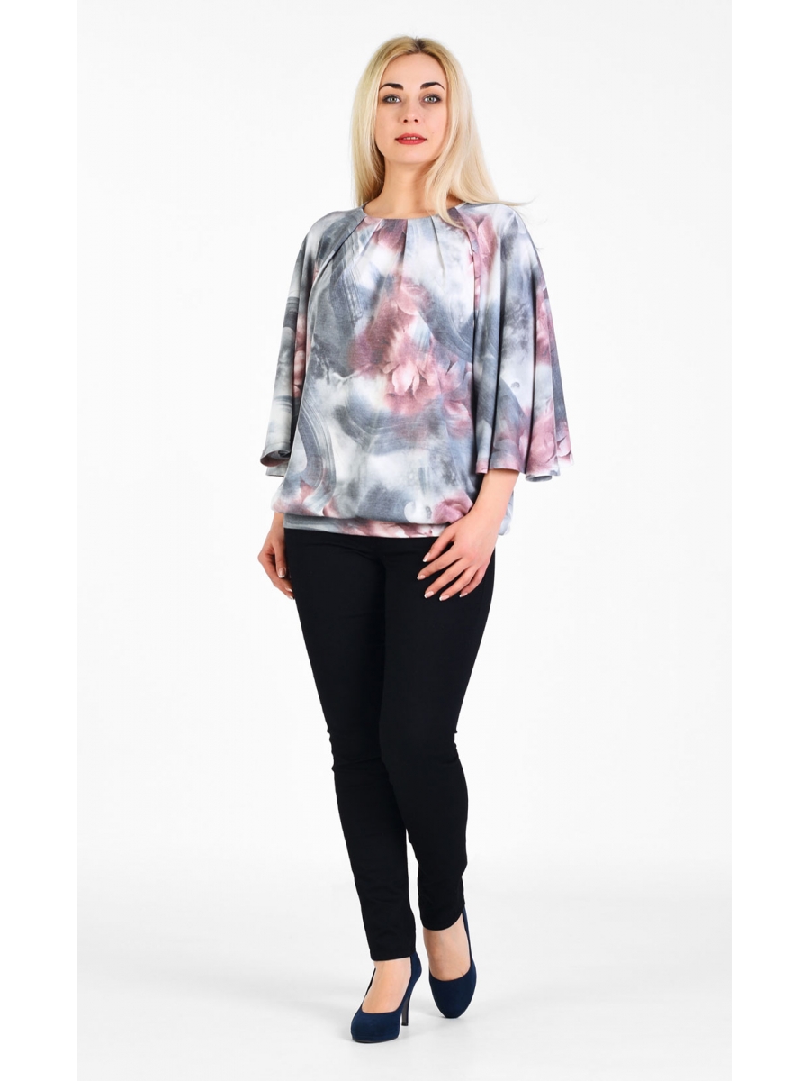 Нарядная блузка фантазийной расцветки из мягкого полотна с круглым вырезом, лучами-защипами от горловины и широкими рукавами-крыльями длиной 3/4. Блузка свободного кроя, не сковывает движения, уравновешивает силуэт, маскирует особенности фигуры. Низ – на круговом эластичном поясе, который фиксирует изделия на бедрах, позволяя выбрать оптимальную для фигуры длину.