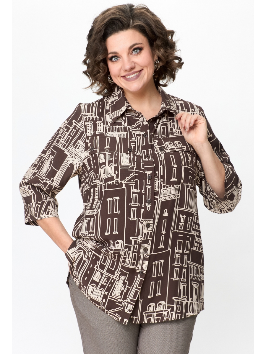 Блуза женская, прямого силуэта из текстильной ткани. Воротник отложной, застежка центральная на петли-пуговицы. По переду нагрудные вытачки и настрочены накладные карманы. Спинка цельная. Рукав втачной, одношовный, 3/4, с притачной манжетой. В боковых швах по низу небольшие разрезы.