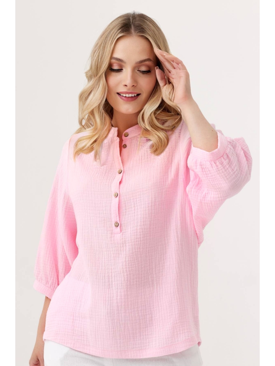 Стильная блузка свободного силуэта из 100% хлопка - муслина. Воротник-стойка Ткань легкая, приятная к телу, не мнется. Блузка имеет свободный крой, идеально в жаркое время года, для путешествия и поездок. Летняя блузка подойдет как в офис, в школу, на деловую встречу, так и на прогулку и для повседневной носки. Блузка универсальная, подходит всем девушкам высокого и невысокого роста. Ткань не меняет цвет. Идеальная посадка на любую фигуру. Стирка при 30 градусов, усадка 5%.