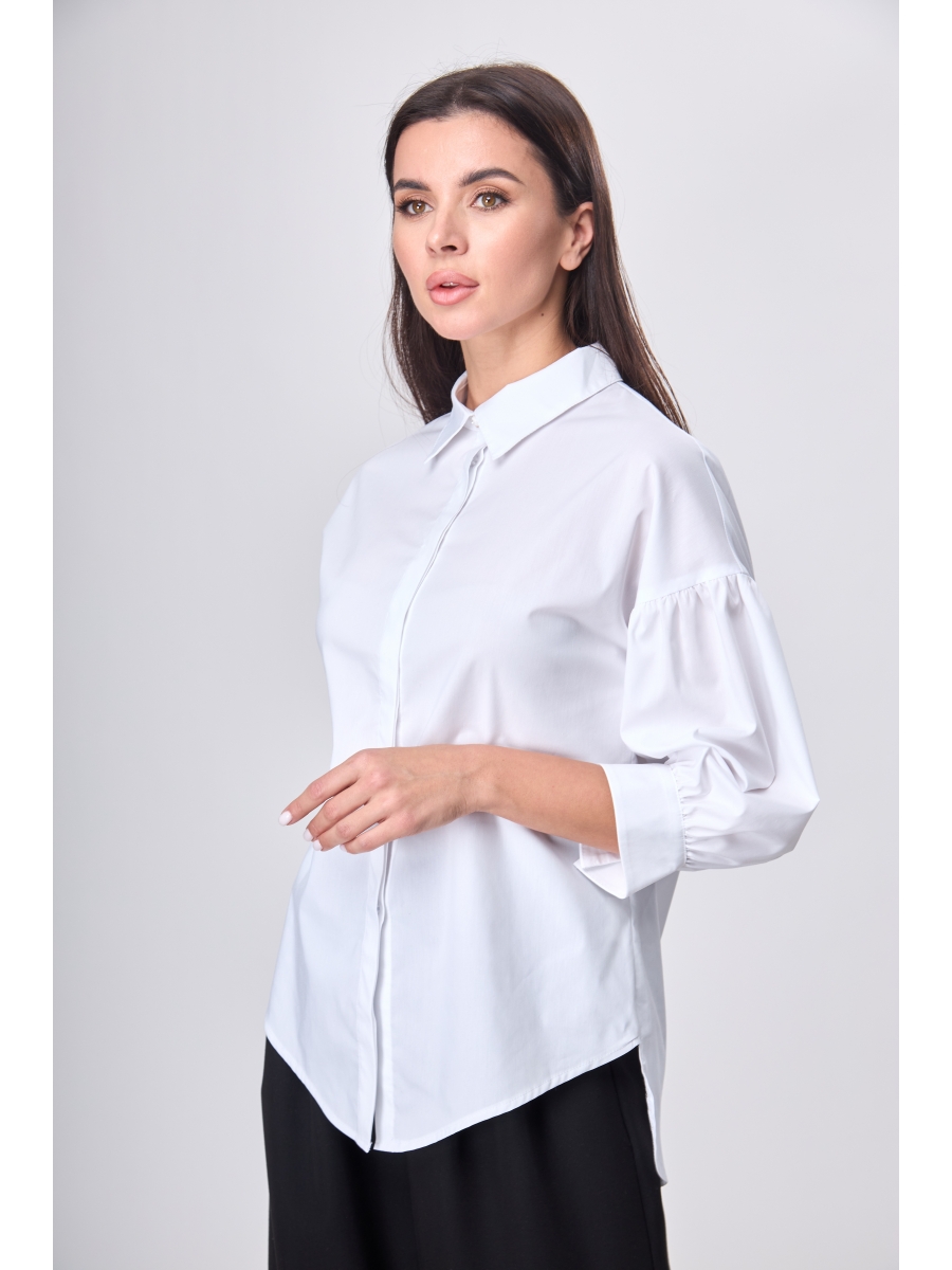 Блуза с нотками романтизма. Нам нравятся такие модели: романтичные на первый взгляд и чувственные при ближайшем рассмотрении. Выполнена из хлопковой ткани. Прямой силуэт. Спущенная линия плеча. Красивый 3/4 рукав со сборкой вверху и по низу на манжете. Рубашечный воротник на притачной стойке, потайная застежка на пуговицы по всей длине блузы. Спинка с кокетливой встречной складкой по центру от линии горловины, скреплённая через расстояния. Низ блузы фигурный. Отличный выбор для каждого дня! При сьемке для образа использованы брюки Anelli 323 синие.