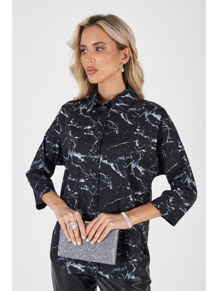 Блуза-рубашка свободного силуэта с застёжкой на пуговицы из вискозной ткани. Низ изделия с закруглениями по бокам. Втачной рукав в спущенную пройму. Вырез горловины обработан отложным воротником на стойке. На задней части изделия выполнена кокетка с небольшой складкой. Достоинство этой модели - в способности скрыть некоторые недостатки фигуры.