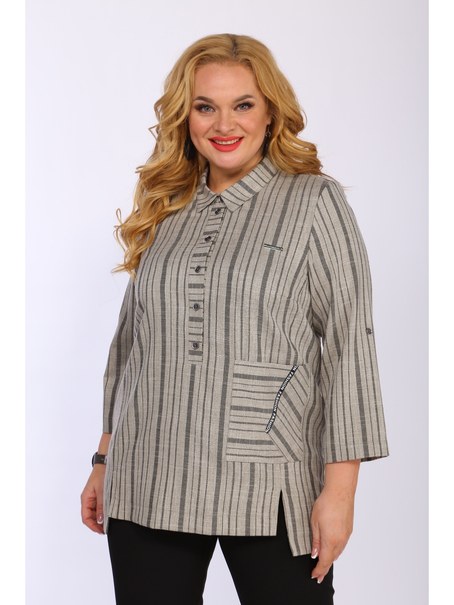 Блузка женская полуприлегающего силуэта с втачными одношовными рукавами. Для регулировки длины рукава имеется пата с пуговицей. Перед с рельефами от проймы до низа, нагрудные вытачки выходят из рельефа. Воротник рубашечного типа на притачной стойке. Застежка центральная, на притачной планке с пуговицами. Перед с функциональным накладным карманом и разрезами по низу рельефов. Спинка отрезная выше линии лопаток.