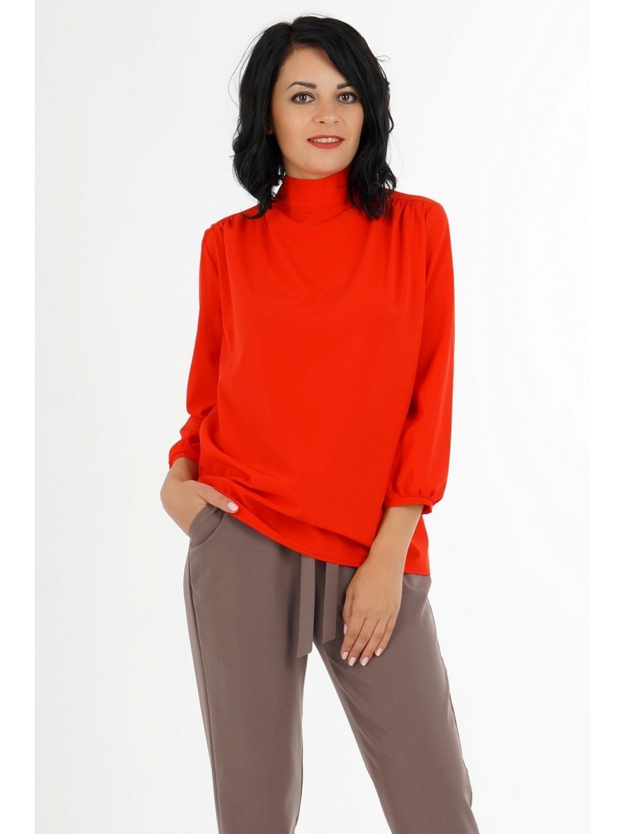 Блуза выполнена из эластичной блузочной ткани. Воротник стойка. Рукава длинные 48 см, на манжетах. Низ прямой. По спине бант. Без подклада.