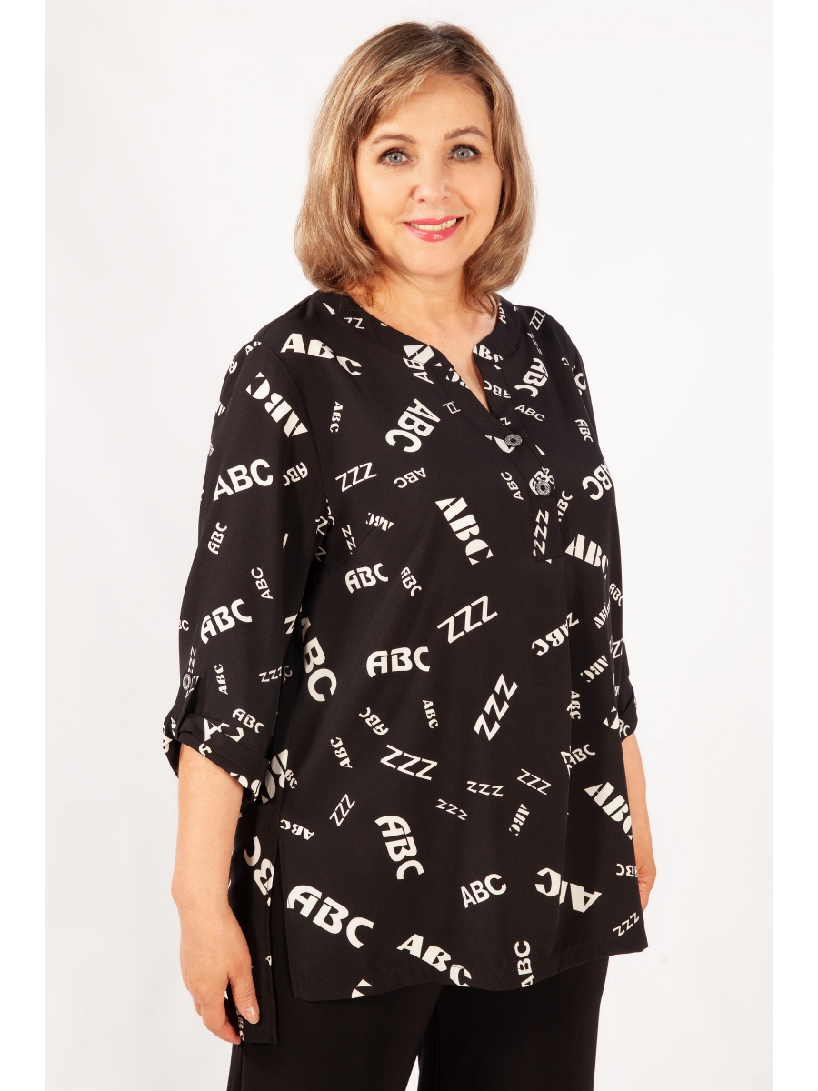 Женская блуза больших размеров, выполнена из нежного, приятного к телу шифона-стрейч. Модель свободного кроя, спереди небольшой разрез с линией декоративных пуговиц, посаженных на планку. Рукав 3/4 с патой. По бокам разрезы.