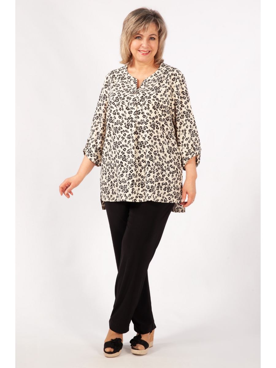 Женская блуза, выполнена из нежного, приятного к телу шифона-стрейч. Модель свободного кроя, спереди небольшой разрез с линией декоративных пуговиц, посаженных на планку. Рукав 3/4 с патой. По бокам разрезы.