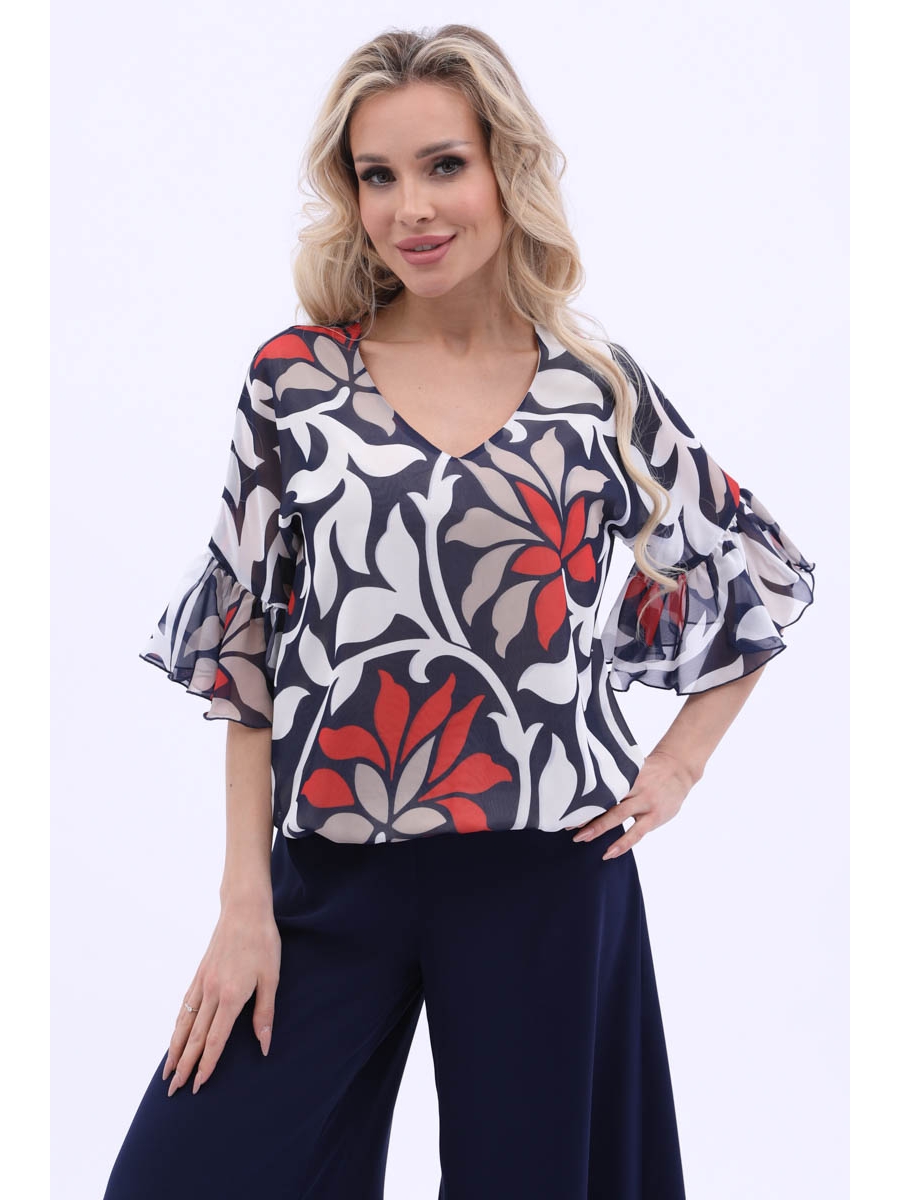 Эффектная блузка полуприлегающего силуэта из текстильной ткани — шифон, сине-белого цвета. V-образный вырез изделия обработан внутренней обтачкой. По низу втачных рукавов — воланы. По низу изделия выполнен манжет с резинкой. Длина изделия по спинке от плечевого шва до низа изделия — 58 см. Рост фотомодели — 170 см.