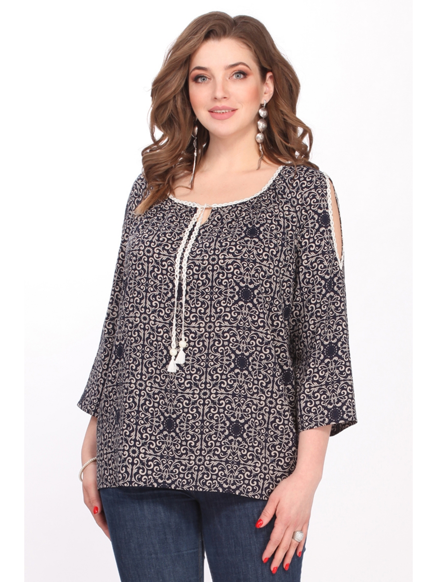 Блуза женская прямого силуэта, вырез горловины круглый, отделан кружевом. Рукав реглан с фигурным вырезом в верхней части, вырез отделан кружевом. Низ изделия и рукава обработан швом в подгибку с закрытым срезом. Реальные параметры блузки 52 ог-124см, об-122см, 54 ог-128см, об-126см, 56 ог-132см, об-130см.