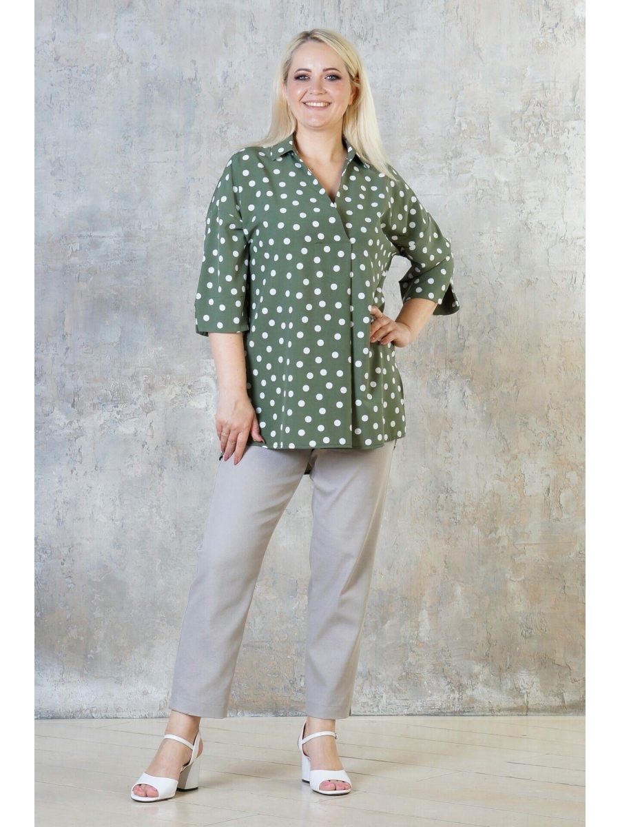Летняя удлинённая блуза свободного силуэта. Выполнена из эластичной блузочной ткани. Рубашечный воротник и V-образный вырез.