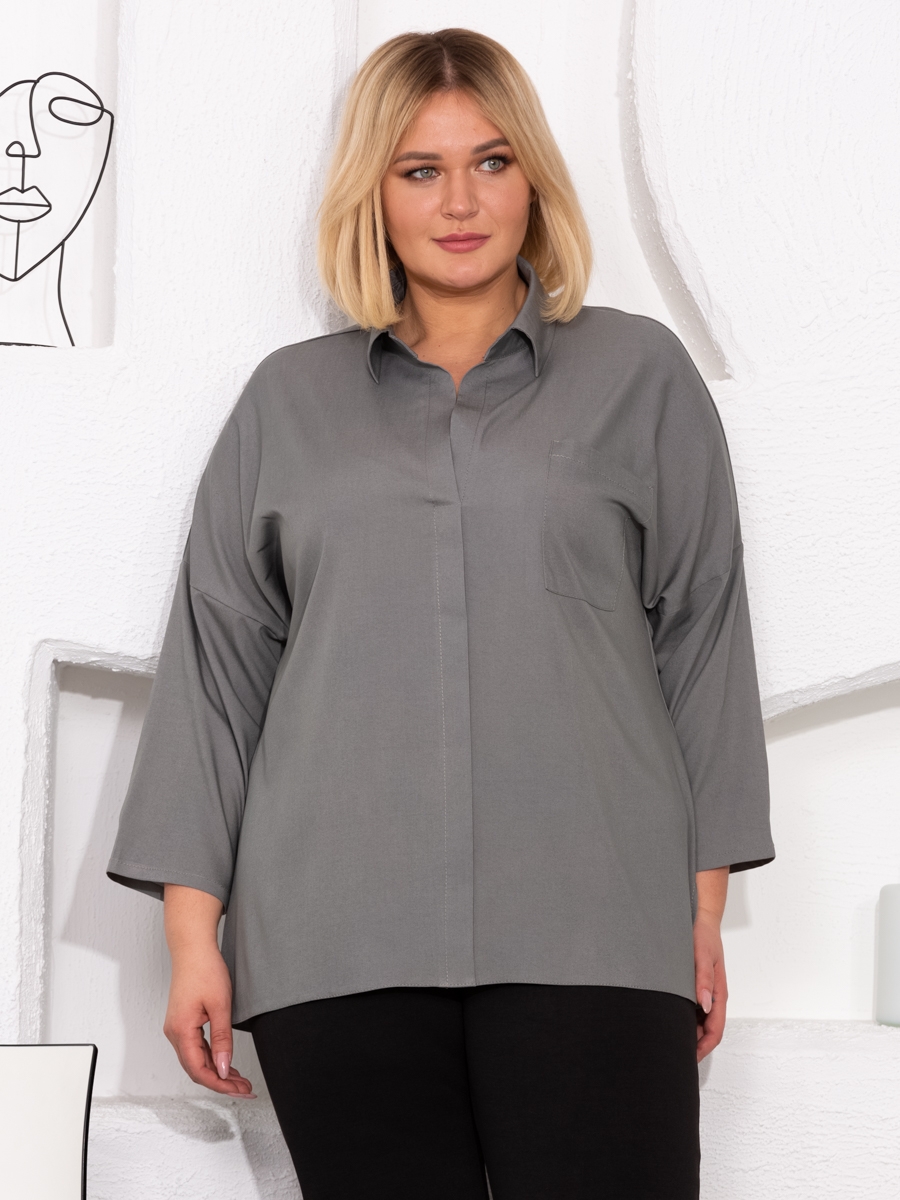 Стильная блуза рубашка для базового гардероба. Длина изделия до середины бедра, рукав 3/4 со спущенной линией плеча, эффектный контрастный крой, V-образная горловина с классическим воротником и имитация потайной застёжки. Блуза прекрасно сочетается с классическими брюками, легинсами и однотонными джинсами, и отлично дополнит гардероб в классическом и современном стилях