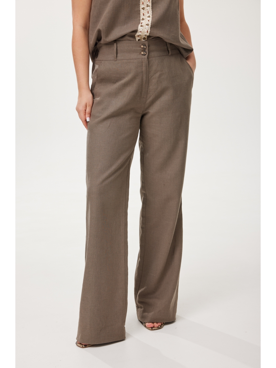 Стильные брюки-клёш изготовлены из качественного натурального льна с эффектом мятости. Брюки летнего ассортимента, свободные от бедра. По переду внутренние карманы. Сзади накладные карманы. Очень удобные. Застёгиваются спереди на молнию и 2 пуговицы. В задней части пояса вставлена резинка.