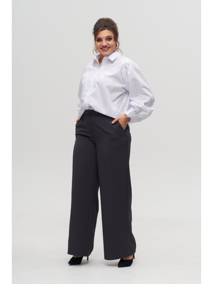 Брюки прямые, удлинённые, с высокой посадкой. По переду талиевые вытачки и боковые карманы. Застежка молния спереди.